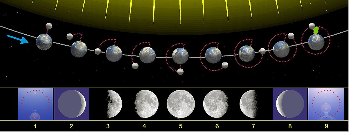 La Lune tournant en orbite autour de la Terre, les positions relatives du Soleil, de la Terre et de la Lune